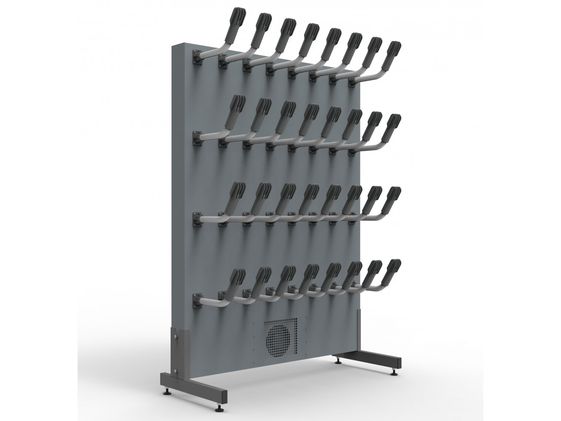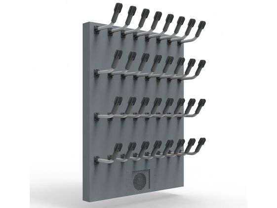 Сушильный стеллаж (стойка) для обуви на 16 пар предназначен для бережной сушки обуви, горнолыжных ботинок, коньков, сапог, перчаток. Может быть установлен на стену или стационарно на ножках.