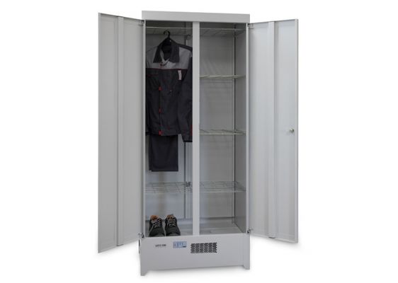 Температура воздуха внутри шкафа достигает 60°С, благодаря нагнетанию воздуха тепловентилятором. Шкаф состоит из двух базовых элементов: шкафа и подставки, соединенными друг с другом болтами. Верхняя часть представляет собой две секции, каждая из которых закрывается на свой ключ. Внутри каждая секция снабжена тремя подвесными сетчатыми полками. На полки можно укладывать для сушки рукавицы, головные уборы или обувь. Подставка сушильного шкафа запирается на откидывающуюся дверцу, через которую осуществляется доступ к управлению тепловентилятором ).